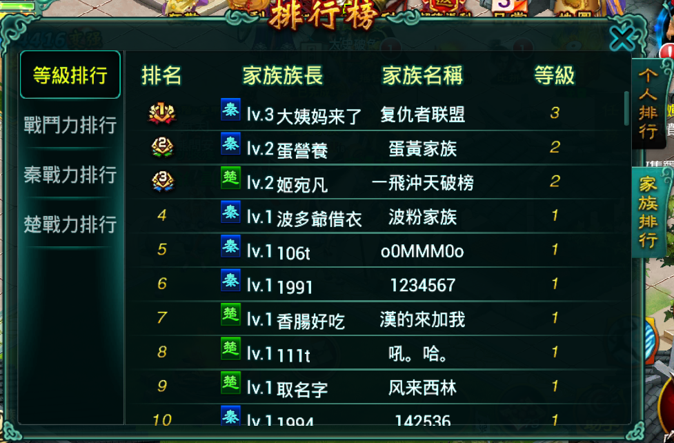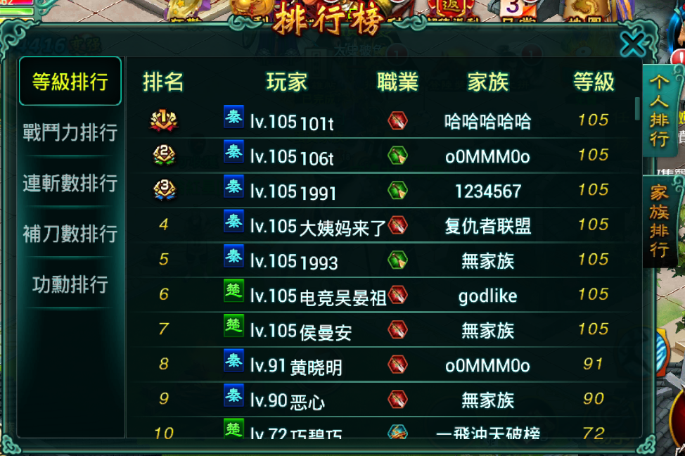 點擊排行榜按鈕可查看到各種排行:等級、戰鬥力、連斬數、補刀數、功勳排行;此外,也有分為個人排行以及家族排行。