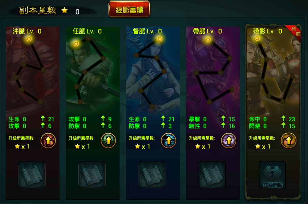 經脈系統也是遊戲中極為重要的屬性提升系統之一;該系統中一共分為5種經脈,分別為沖脈、任脈、督脈、帶脈以及殘影(75級開放)。升級經脈需要消耗星數,而星數可透過英雄本獲得。