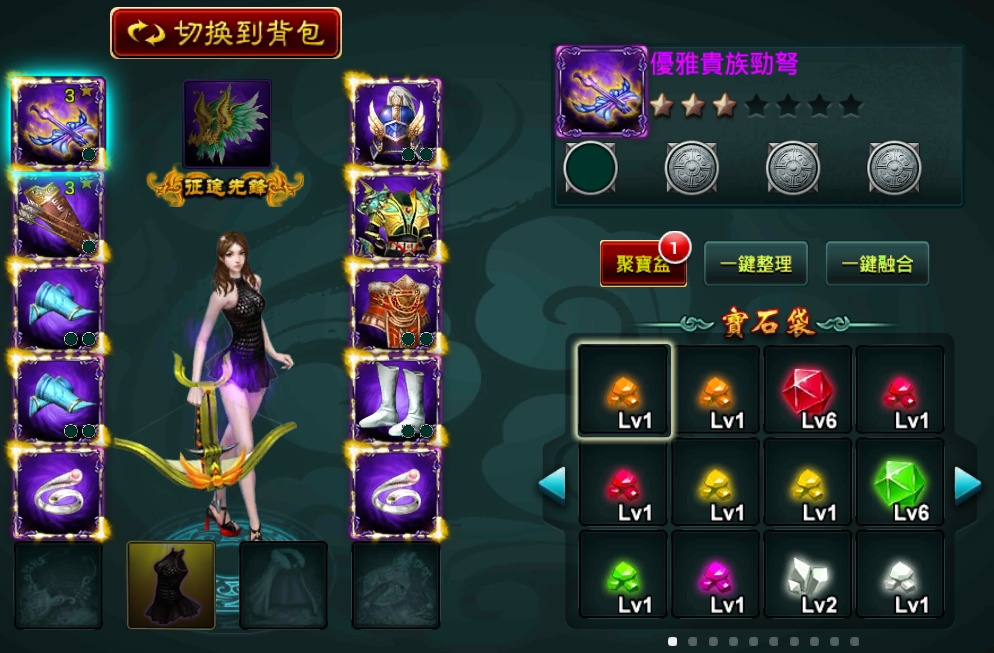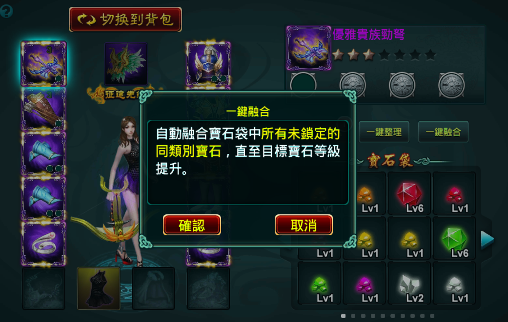 若想合成寶石,首先點擊一鍵融合,然後選取目標寶石,系統會自動融合背包內所有同類別同等級寶石,直至目標寶石等級提升。