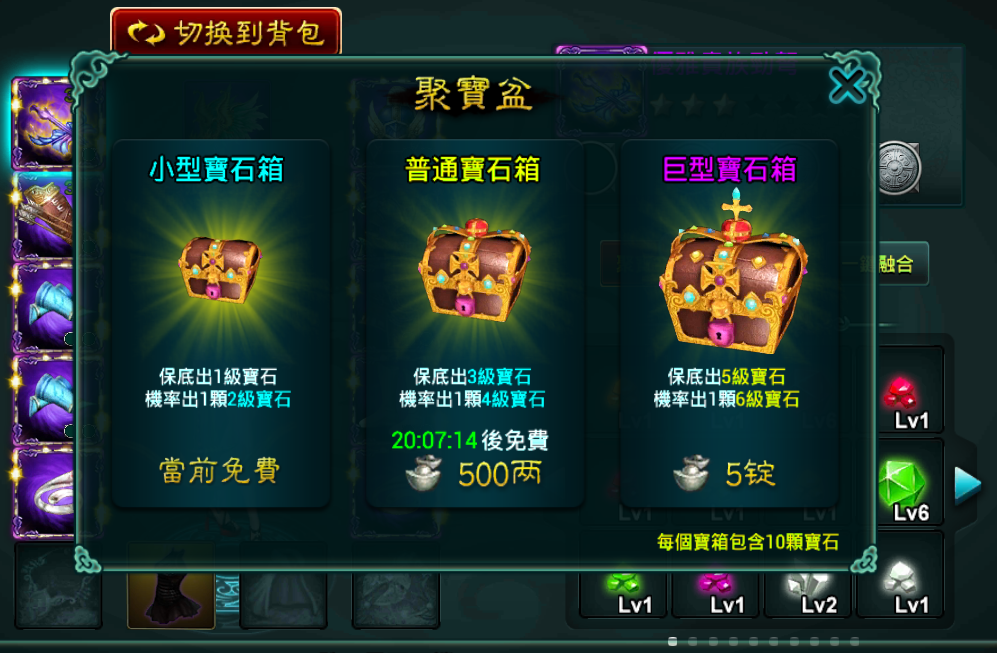 如果玩家想快速獲取寶石的話可以進入該介面的聚寶盆介面,通過花費金幣抽取即可快捷的獲得大量寶石。