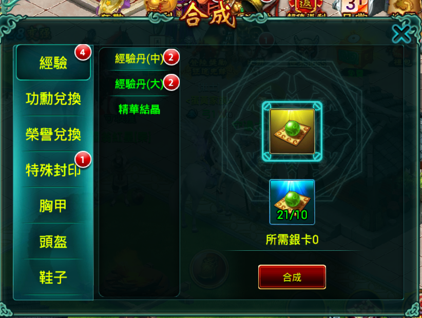 材料合成 目前該系統主要是裝備晶石的合成,可透過新月瓶祕寶獲得晶石,然後再根據自身需求合成相應的裝備晶石。 寶石袋合成 玩家通過日常任務,活動,副本掉落等會活動一定數量的寶石碎片,通過此系統可以合成相應的寶石袋,獲得相當數量的寶石。 經驗丹合成 玩家通過任務,獎勵等獲得的小經驗丹可以通過此系統合成高等級的經驗丹