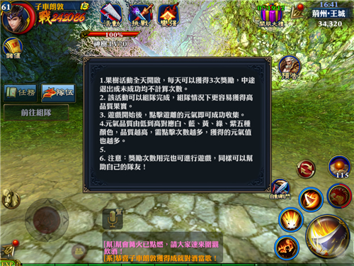 在這個任務的過程當中,是可以進行組隊的,而組隊幾個人同時收集元氣絕對比你一個人收集要快得多。值得注意的是,即使少俠沒有獲得獎勵的機會,但是同樣可以幫助別人獲得元氣,所以不要太過小氣,經常幫助別人,別人也會經常幫助你,如果能在幫派裡面找到幾個固定的好友那就更好了。