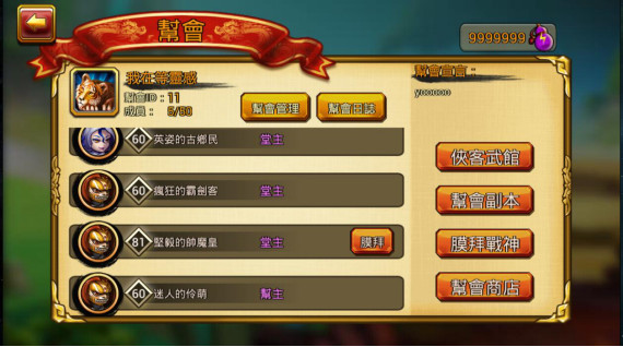 2.創建幫會或者加入幫會之後,會進入幫會主界面,左側為幫會成員列表,右側為幫會功能,幫會管理為入幫申請、成員管理等功能。