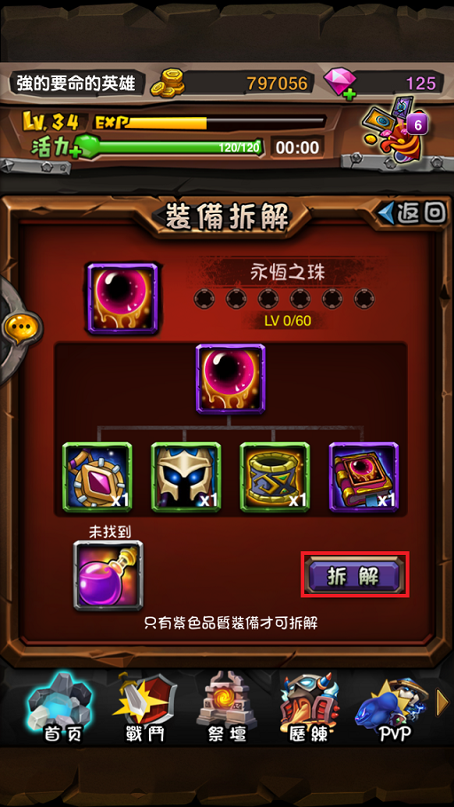3. 點擊「拆解」就能成功的拆解裝備,拆解後獲得的道具將直接進入你的背包!