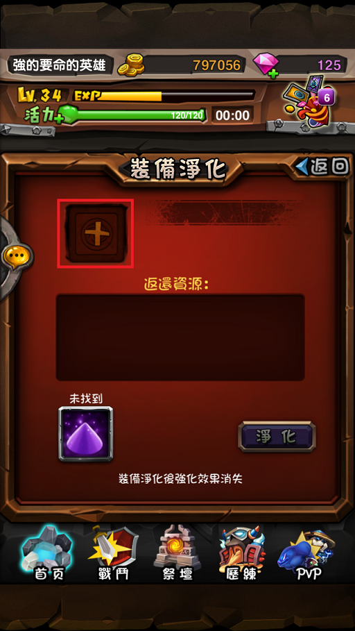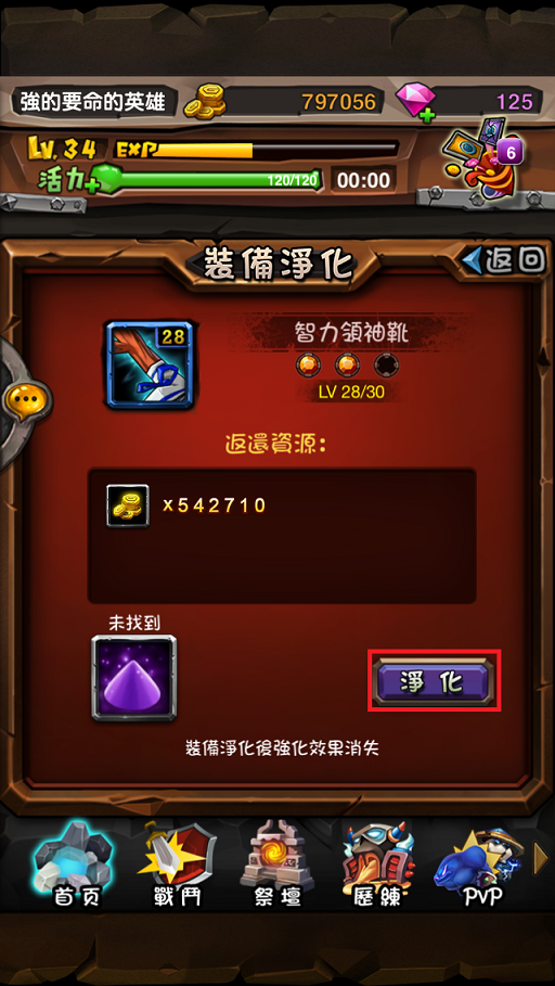 3. 點擊「淨化」就能成功的淨化裝備,淨化後返還的金幣和強化結晶將直接添加到相應數值上,無需領取