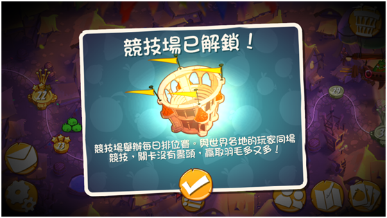 競技場的關卡沒有盡頭,在小鳥用盡前,可以一直進行挑戰。挑戰結束后,按玩家得分進行排名,排名影響所獲得的羽毛數量。