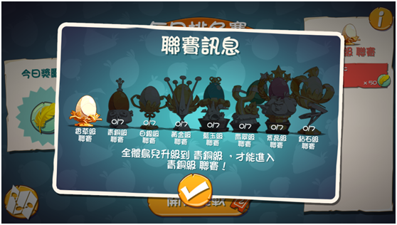 聯賽共計8個級別。初始所有玩家均在“香草級聯賽”。當玩家全部鳥兒升至下一下一級別後,即可進入下一聯賽。