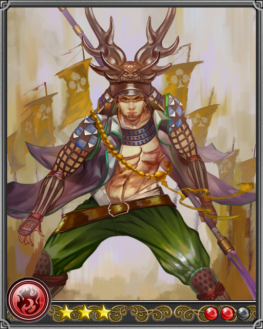 | 被豐臣秀吉讚為「日本第一、古今獨步的勇士」,戰國時代首屈一指的猛將。從年輕到死亡都一直侍奉著德川家康。忠勝一生參加57次戰役,數度奮戰拯救德川家康於危難中,據說他從來沒有在戰鬥中受傷過。他手中帶著據說連蜻蜓停在刃峰上都會被切成兩半的名槍,蜻蛉切縱橫沙場。他曾在小牧長久手之戰中,以500兵力與豐臣軍38000人對峙等,有關於他的英勇傳說不可勝數。 | |||||