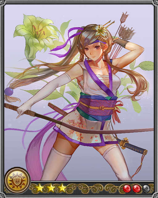| 喪命於瀨戶內海的悲情女武將。她出身於伊予河野氏一門,大山衹神社的大宮司大祝氏。被尊稱為瀨戶內的聖女貞德。降臨到鶴姬身上的悲劇,就是她最愛的戀人同時也是最信任的左右手越智安成的戰死。那是在大內氏第三次展開進攻時。鶴姬集合殘存兵力進行反擊,趁大內軍不備將其擊退,但是同時失去兄長及戀人的打擊太大,她在18歲時就跳水自殺了。 | |||||