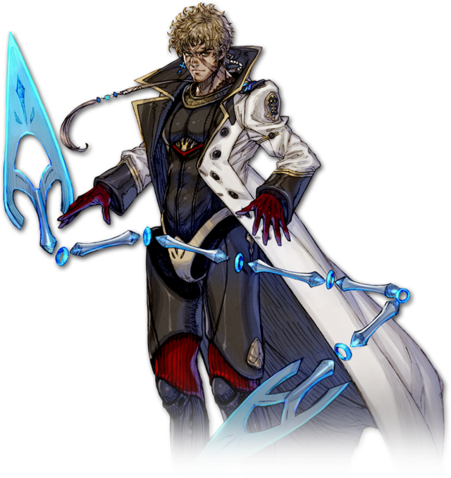 | 王立親衛隊隊長。35歳。規律を重んじ、またどんな時にも身を挺することを辞さない護衛技術と責任感が評価され、ノンキャリアながら隊長に就任した。だが家庭では酒に浸り、尊大に振る舞う典型的な内弁慶でもあった。妻はそんな彼にあきれ、家を出た。結局、ひとりでしか生きられない不器用な男なのだ。 |