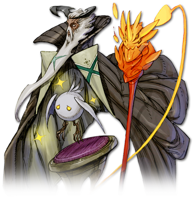 | ミニバクロウを愛玩動物のように召し抱える岩人の魔導師。彼とミニバクロウの絆は炎をより激しく燃やす。余命いくばくもない彼は、終の場所を求めていたが、星の中心を目指すという旅人たちの熱意にほだされ、重い腰をあげた。ミニバクロウは一般的に他種族には懐かないのだが、特殊な遺伝子構造をした生物にのみ心を許し、共生が可能らしい。その理由は現在も研究中である。 |