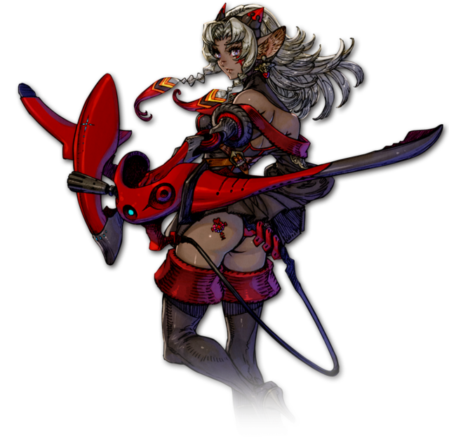 | 自慢の肢体をさらけ出し、無防備で性に奔放なケモノ。それは彼女なりの論理によりはじき出された処世術であり、たしなめられることもあるが利益を得る手段だと歯牙にもかけない。廃棄された機械を集めて作った機巧弓は彼女自身のお手製である。 |
