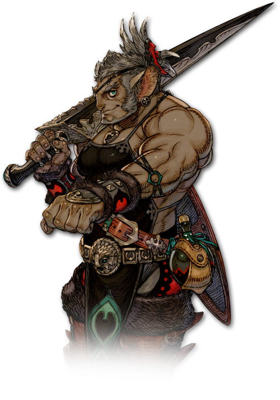 | 身長が低くずんぐりした体で、首が短い。すでに絶滅したドワーフのような風貌をしたケモノの戦士。雪山の洞窟で暮らしていた為体内脂肪が発達しており、見た目よりもぎっしりと詰まった身体は非常に重い。ジャンプと着地により大地を揺るがす特技がある。 |