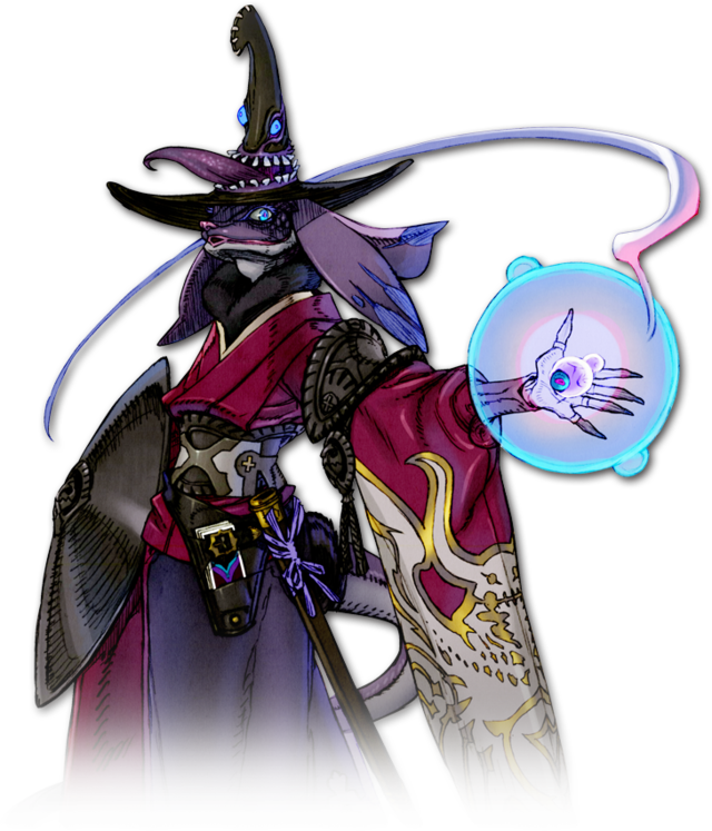 | 長きに渡り、瘴気と共にあったせいで紫色に変色したトカゲ。瘴気が蓄積した食物を食み、瘴気が溶け込んだの風呂につかり、瘴気そのものを肺に入れては吐き出す生活を続けた結果、彼女の身体は瘴気を克服し、共存に成功した。これは奇跡の産物である。そんな彼女に触れるとその手は朽ち果ててしまう。彼女の息を吸えば神経を冒されてしまう。しかし彼女が持つ刀は決して朽ちることはない。長い年月を生き神格化した刀は妖刀と化し、彼女の瘴気をも取り込んでしまうのだ。そんな妖刀を触媒にして、瘴気を孕む魔の力はさらに拡散していく。いつしか生ける大量破壊兵器と化した彼女の存在そのものが、トカゲたちの間で最高難度の黒魔術と認定され、魔女と呼ばれるに至った。 |
