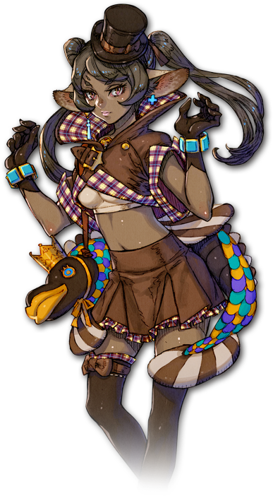 奇抜な衣装に身を包む、ケモノの少女。地上のショービジネス界で、いわゆるアイドルとして活動している。踊りが大好きでいつも何らかのステップを踏んでいるが、今のところそこまで上手ではないので妙にしっくりこない。そんな欠点がありながらも、自分がアイドルであることを鼻にかけ、ややツンとした態度をとっている。そんなギャップが人気に拍車をかけているようだ。