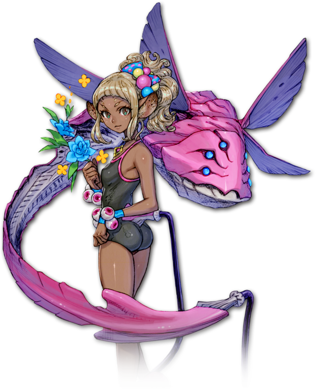 奇抜な衣装に身を包む、ケモノの少女。地上のショービジネス界で、いわゆるアイドルとして活動している。花が大好きで、いつも土ごと服のポケットに入れて育てている。彼女はどうやらケモノとしては希少種なようで、「緑の手」と呼ばれる特殊な力を持っている。「緑の手」は命と力を育む力であり、だからこそ彼女が愛し、常に携帯している植物は大地を離れてなお育っているらしい。