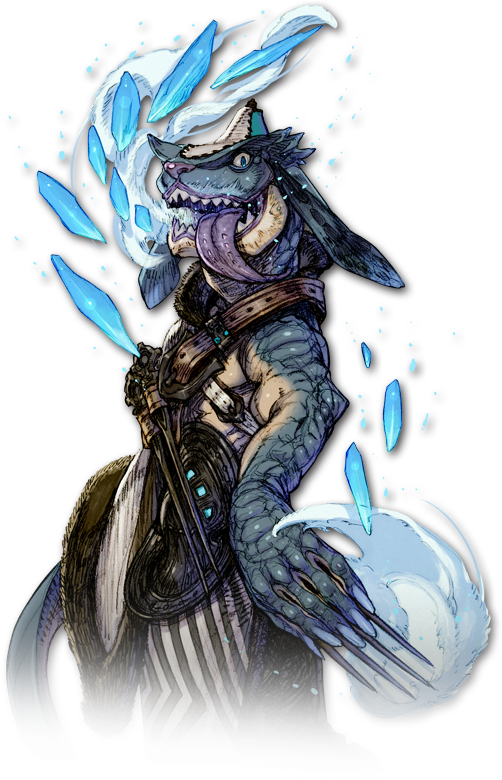 口から吹雪のような風を吐き出すトカゲ。口の周りはいつも凍っていて、氷が涎のようになっている。ちょっとだらしない容貌なのだが、本人はイケてると思っている。だから彼が酒場で女性に声をかけてこっぴどくフラれても、しょげるどころか相手の見る目が無いとのたまう。