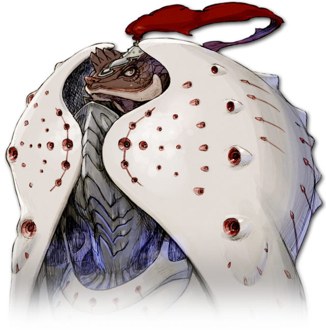 | ぶ厚い鎧を幾重にも身にまとったトカゲの重戦士。元々硬質な皮膚がトカゲの特徴ではあるが、彼の場合それが群を抜いている。その特徴を最大限に活かすのが、鎧に取り付けられた無数の小型ボウガンと手に持つ弩級のボウガンによる斉射。固定砲台戦法だ。 |