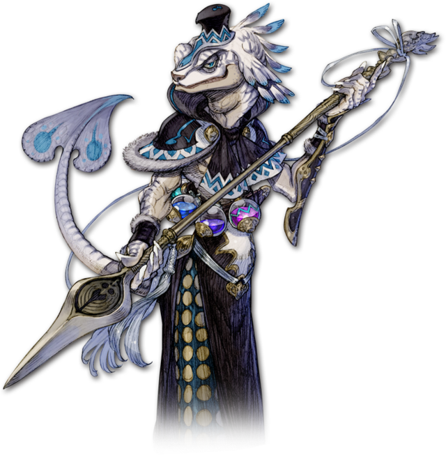 | 神経質な細身のトカゲ。特殊な毛穴を持つ部族出身で、発情期になると毛穴から生魚のハラワタとまで言われる芳香を漂わせる。その臭い成分を抽出した香水が売られているというから驚きだ。そんなものをだれが買うのかはまったくの不明だが、毎月一定額のライセンス料が支払われている。需要はあるらしい。余談だが、彼には軍師としての才能がある。優れた動体視力と広い視野で戦場を見渡せるのだ。 |
