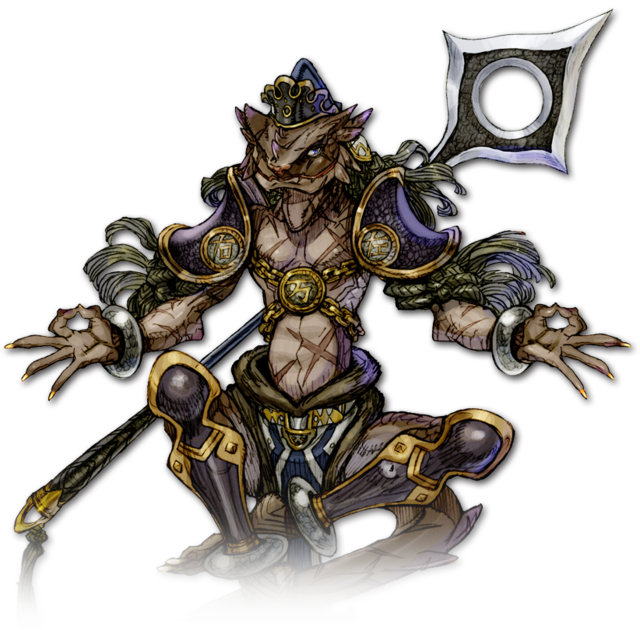 | 力のみで生き抜いてきたと豪語するトカゲ族の戦士。実のところ、彼は親に棄てられ山野でひとり生き抜いた孤児であった。棄てられてまもなく、飢えたテンに襲われ死の淵をさまよった。通りがかった荒くれ者に命を救われるが、今度は彼らの駒として戦いを強いられた。体についた傷痕は、彼の強さの証明である。 |