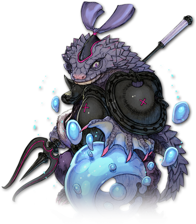 | 刺のような特殊なウロコで全身を覆われたトカゲの水兵。手にある大きな水かきを大きく膨らませ、水を高速でかきあげて起こす水の奔流は容易に敵を飲み込んでいく。水の無いところでは、地道に手にした槍で戦うしかないのでそうしている。 |