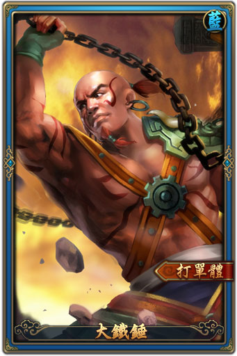 | 蓄力技說明 | 猛力揮出一拳,在空氣中產生一股非常可怕的強力漩渦,使置身在漩渦其中的人無法脫出,越陷越深。 | 暴力技說明 | 大鐵錘所修煉的武功,極其霸道。攜帶雷神之力的巨錘,別說碰上,丈外便可以將敵人轟為齏粉。 |