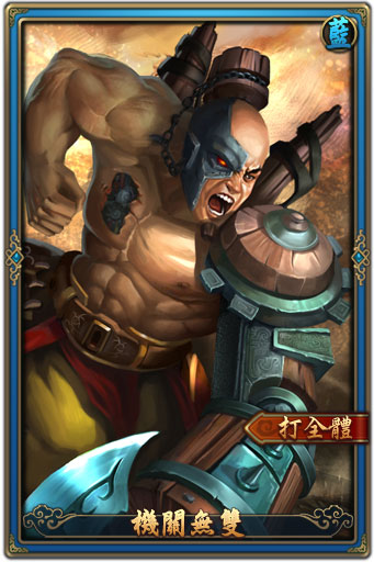 | 蓄力技說明 | 將自身機關技能提升至極限,發出巨吼震懾敵人的同時提升自己的防禦。 | 暴力技說明 | 利用巨大的機關手臂發向敵人發起毀天滅地的攻擊。 |