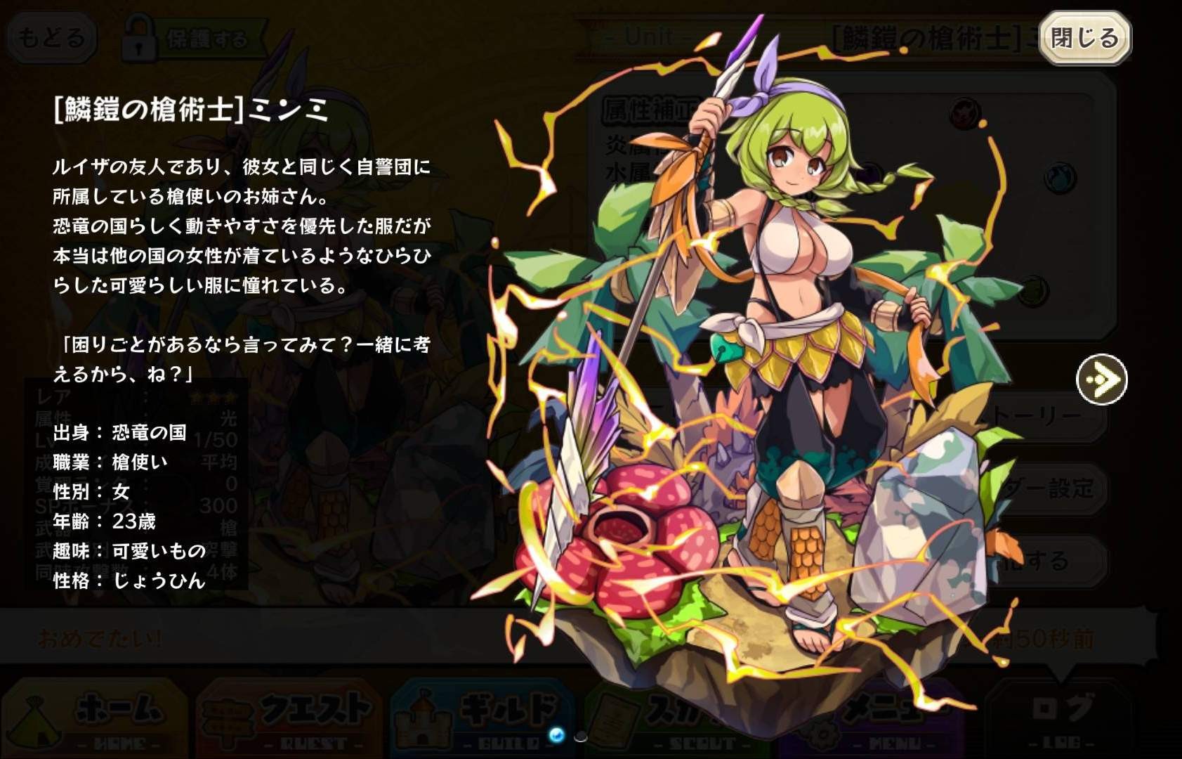 | 名稱 | 「鱗鎧の槍術士」ミンミ | 出身 | 恐竜の国 | ||
