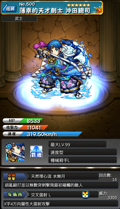 | 主動技 | 名稱 | 天然理心流 水無月 | 冷卻回合 | 16 回合 | ||
