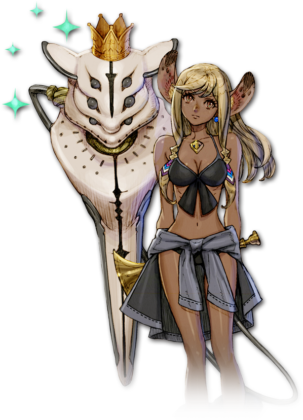 | 奇抜な衣装に身を包む、ケモノの少女。地上のショービジネス界で、いわゆるアイドルとして活動している。ちなみに不動の人気NO.1である。歌が大好きで、いつもなにかの曲を口ずさんでいる。ただ、彼女の作詞センスは絶望的で、ファンをして「ちょっと笑えない」と言わしめる。歌は上手なことが余計に涙を誘うらしい。 |