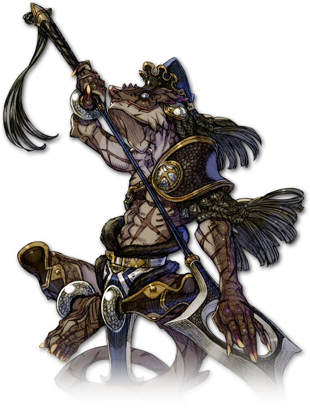 | 力のみで生き抜いてきたと豪語するトカゲ族の戦士。実のところ、彼は親に棄てられ山野でひとり生き抜いた孤児であった。棄てられてまもなく、飢えたテンに襲われ死の淵をさまよった。通りがかった荒くれ者に命を救われるが、今度は彼らの駒として戦いを強いられた。体についた傷痕は、彼の強さの証明である。 |