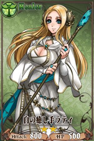 | 治癒術 我方全體治療相當於回復力3 至5 倍的HP。 (測試後白の癒し手ラティ、熱き癒し手マリナ為5倍;二ツ星教授ヨナ為3.5 倍, 穴掘り師カルデア為3倍) 發動台詞 さぁ元気になって |