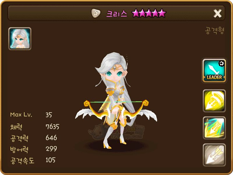 名稱 | 克裡斯 | 屬性 | 光屬性 | 類型 | 攻擊型 | 攻擊速度 | 105 |