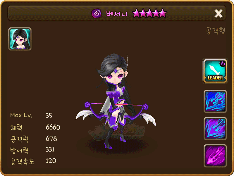 名稱 | 貝瑟尼 | 屬性 | 暗屬性 | 類型 | 攻擊型 | 攻擊速度 | 120 |
