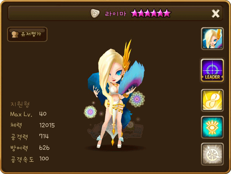 名稱 | 萊瑪 | 屬性 | 光屬性 | 類型 | 輔助型 | 攻擊速度 | 100 |