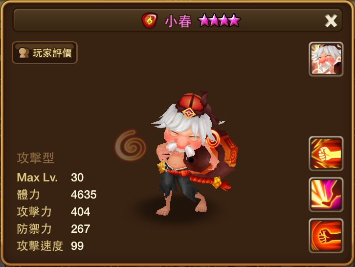 名稱 | 小春 | 屬性 | 火屬性 | 類型 | 攻擊型 | 攻擊速度 | 99 |