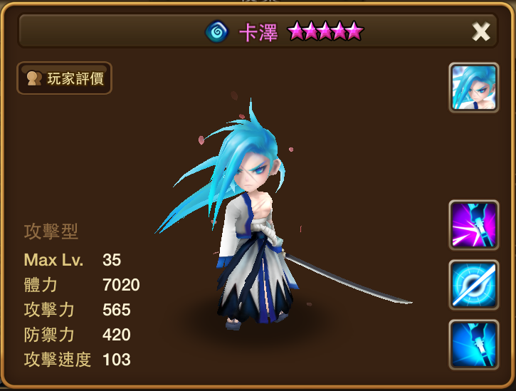 名稱 | 卡澤 | 屬性 | 水屬性 | 類型 | 攻擊型 | 攻擊速度 | 103 |