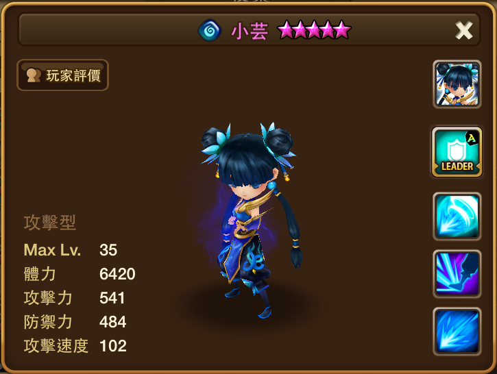 名稱 | 小芸 | 屬性 | 水屬性 | 類型 | 攻擊型 | 攻擊速度 | 102 |