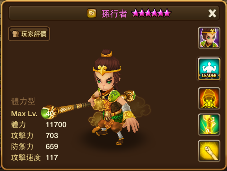 名稱 | 孫行者 | 屬性 | 風屬性 | 類型 | 體力型 | 攻擊速度 | 117 |