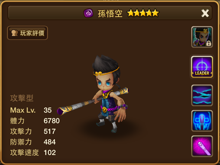 名稱 | 孫悟空 | 屬性 | 暗屬性 | 類型 | 攻擊型 | 攻擊速度 | 102 |