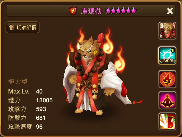 名稱 | 庫瑪勒 | 屬性 | 火屬性 | 類型 | 體力型 | 攻擊速度 | 96 |