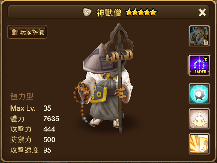 名稱 | 神獸僧 | 屬性 | 光屬性 | 類型 | 體力型 | 攻擊速度 | 95 |