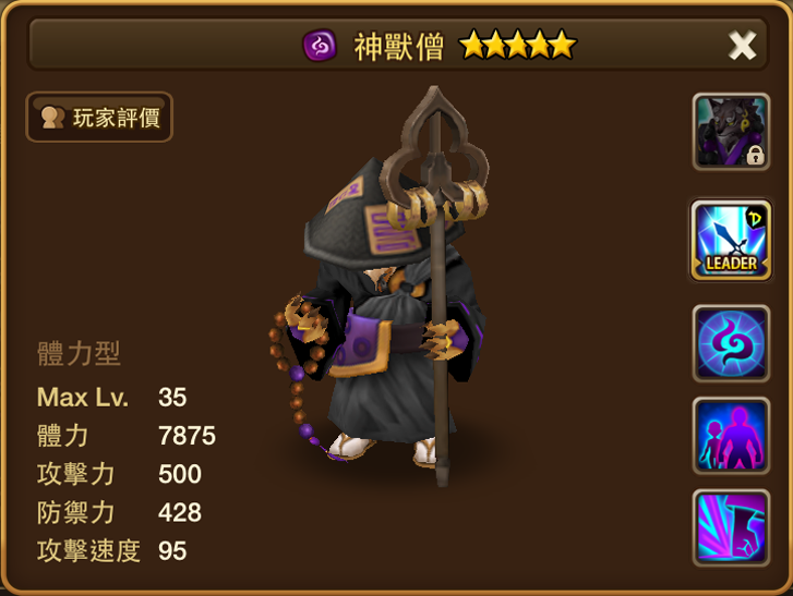 名稱 | 神獸僧 | 屬性 | 暗屬性 | 類型 | 體力型 | 攻擊速度 | 95 |