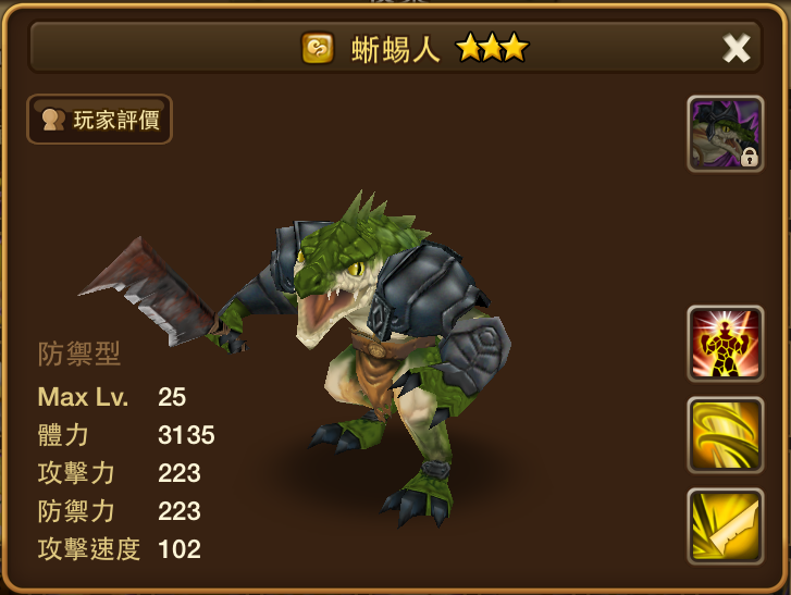 名稱 | 蜥蜴人 | 屬性 | 風屬性 | 類型 | 防禦型 | 攻擊速度 | 102 |