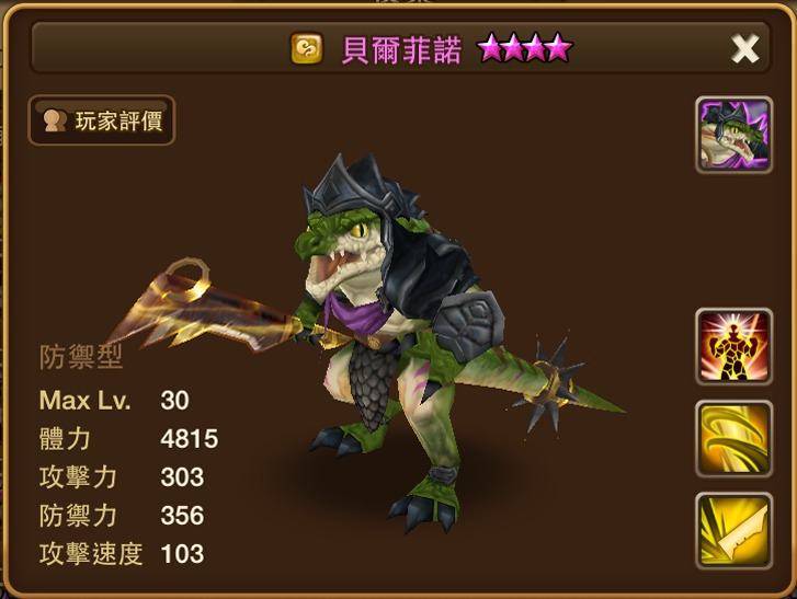 名稱 | 貝爾菲諾 | 屬性 | 風屬性 | 類型 | 防禦型 | 攻擊速度 | 103 |