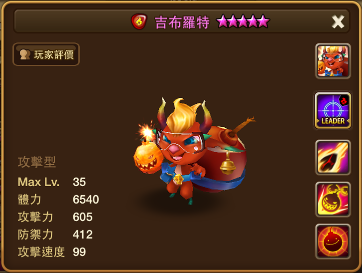 名稱 | 吉布羅特 | 屬性 | 火屬性 | 類型 | 攻擊型 | 攻擊速度 | 99 |