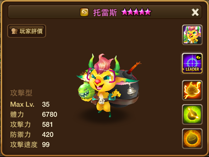 名稱 | 托雷斯 | 屬性 | 風屬性 | 類型 | 攻擊型 | 攻擊速度 | 99 |