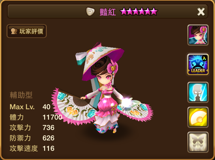 名稱 | 豔紅 | 屬性 | 光屬性 | 類型 | 輔助型 | 攻擊速度 | 116 |