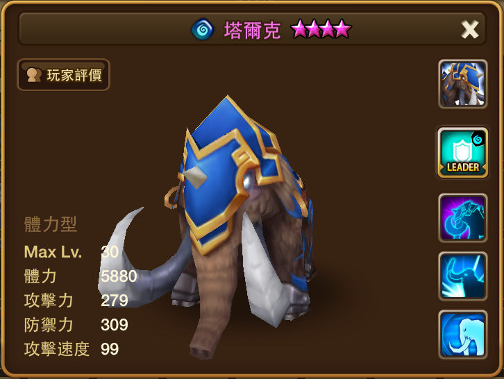 | 極地的咆哮 | 用振奮軍心的咆哮恢復我軍體力,並增加2回合的防禦力。自身體力越高恢復星越多。 | 冷卻時間4回合 | |
