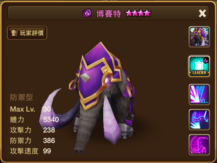 名稱 | 博賽特 | 屬性 | 暗屬性 | 類型 | 防禦型 | 攻擊速度 | 99 |